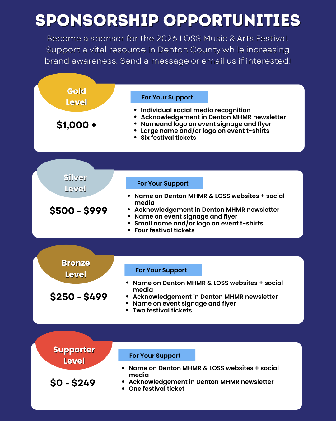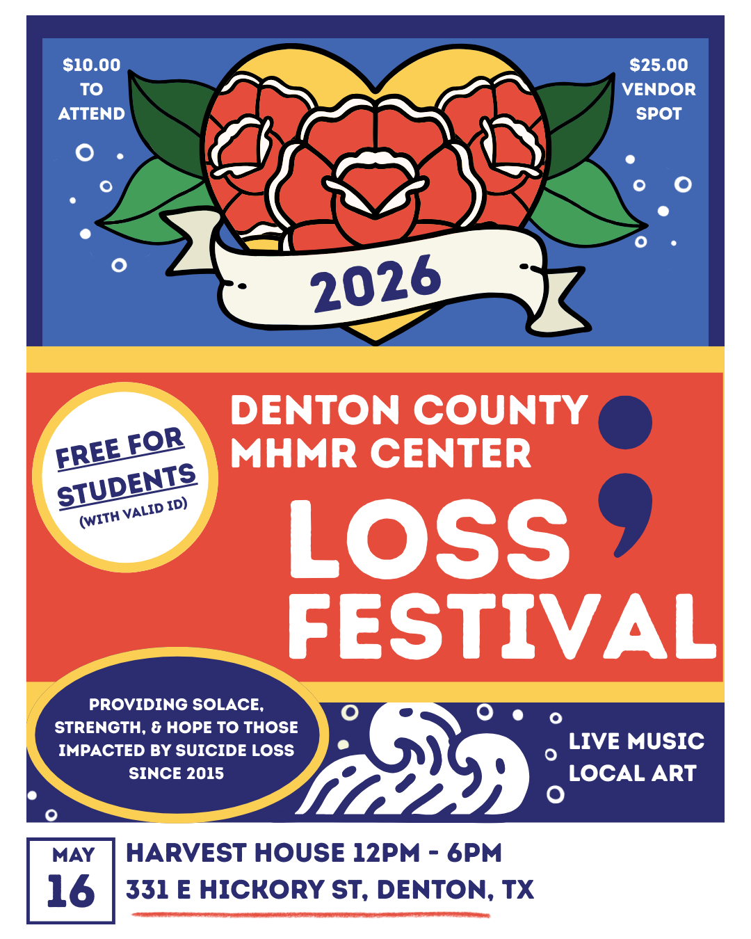 The Denton County Local Outreach to Suicide Survivors Team invites you to our annual LOSS Music and Arts Festival, a fundraiser supporting our mission to ensure that no one in Denton County has to navigate the grief of losing a loved one to suicide alone.